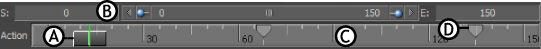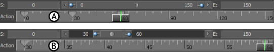 The Action Timeline Start (S) and End (E) fields (A and B) reflect the start and end frames of the current take. When you change the length of the current take, the length of the Action timeline changes to match the current take.