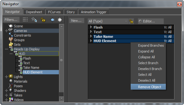 To delete a HUD element under a HUD asset in the Navigator window:
