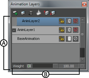 Animation Layer editor A. Animation Layer pane B. Weight slider