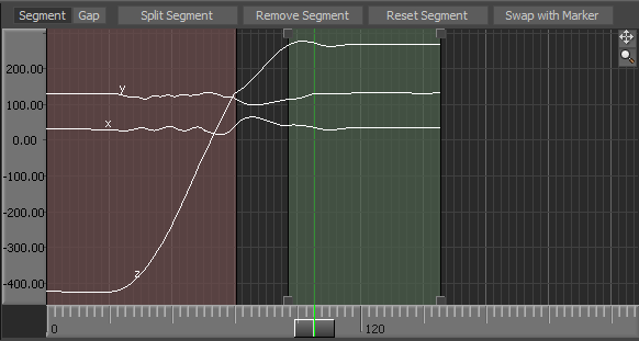 The Optical editor shows the data segments labelled by the selected marker and the gap or unlabelled data segment between the labelled data segments. Segments are either green, red, or blank, depending on their status and type of data they represent.