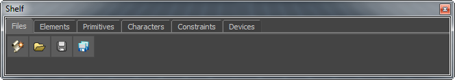 By default, the Shelf tool displays the New File, Open, Save, Save As options in the File tab. The following table lists other tabs and objects within each tab in the Shelf.