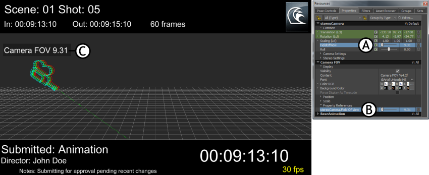 Viewer and Resources windows A. Field Of View property B. Field Of View property added to Camera FOV HUD element properties C. Field Of View property value