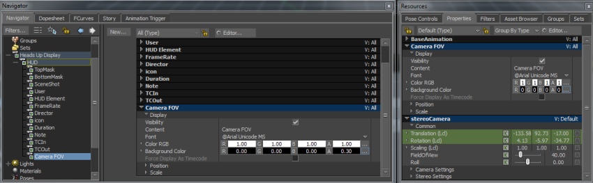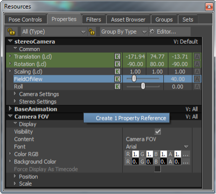 - Click the Field Of View property under the Resources > Properties > stereoCamera properties, and then drag it and drop on the Camera FOV HUD element properties.