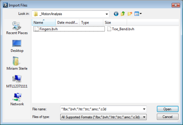 To import files, select File > Motion File Import from the MotionBuilder menu bar. The Import Files dialog box displays letting you choose one or more files for import.