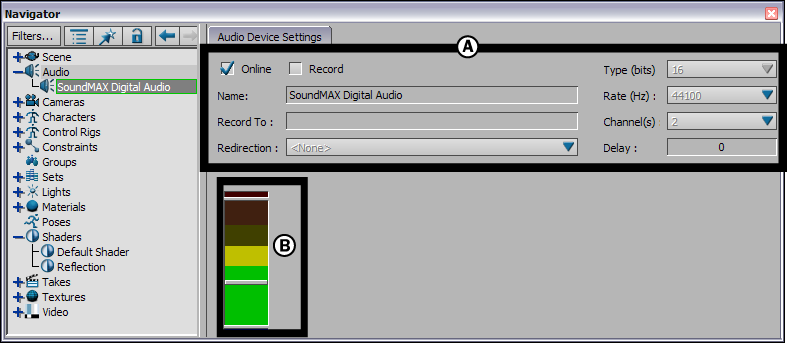 | Redirection | Lets you select the audio output device to which you want to output the recorded audio. Any audio output hardware connected to your computer, and which is automatically detected and added by MotionBuilder, can be selected. |