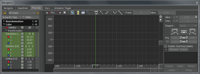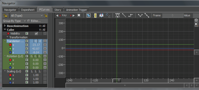 - In the FCurves window Properties pane, click the Translation (Lcl) header to select the cube’s Translation properties.