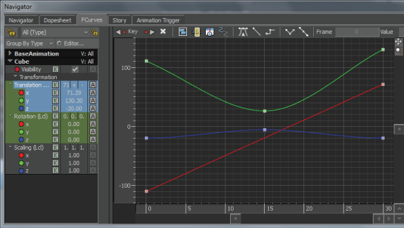 Now that you’ve set a keyframe, you can also modify the function curves by manipulating the keyframes on the function curves themselves, or change the time or value in the FCurves Options pane.