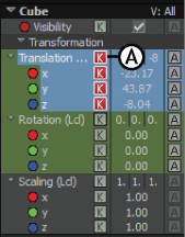 - In the Properties pane, click the Keyframe (K) button next to the Translation (Lcl) header to set keyframes for the X, Y, and Z translation properties simultaneously.