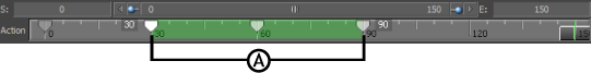 You can select and edit visual keyframes and visual keyframe regions on the Action timeline. The keyframes at either side of a keyframe region display in white, and the region displays in green.