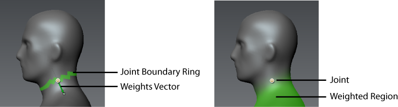 You can select from different methods for setting this initial weighted region using the Weights options in the Create Joint properties. You can also adjust the weighted region using the Weights tool. See Adjust a joint's region of influence.