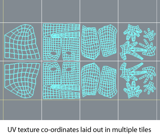 UVs must be explicitly laid out in a tiled configuration using your 3D modeling or UV editing application. For more information on how UV tiles work, see UVs overview.