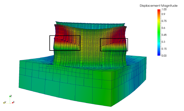 This card is used to simulate support structure failure during powder bed processing. This card specifies the ultimate stress of the support material input by *CLIF, within the *MATE card block for the build material properties. When the Z component of stress at the support-build interface exceeds the specified ultimate tensile stress, the element fails, producing a warning in the output file. A failed element remains in the mesh but does not resist deformation. An example of failed elements is shown in the following figure.