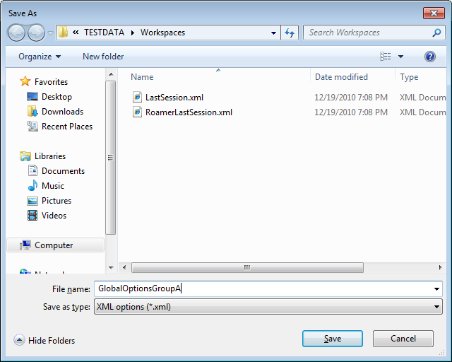 5. In the Save As dialog box, enter a name for the settings file. You can also select the name of an existing settings file to overwrite it with your modified configuration.