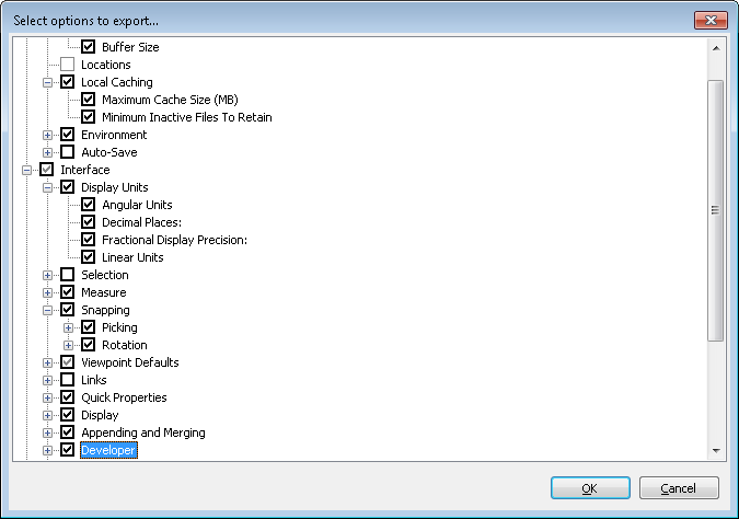 3. In the Select Options to Export dialog box, select the check boxes for all options you want to be exported (or “serialized”). If an option cannot be exported, it is grayed out.