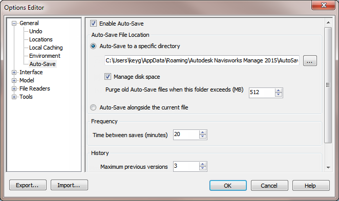 - Adjust the Auto-Save options, as required. For example, if you want Autodesk Navisworks to save a backup file every 20 minutes from a significant file change, enter 20 into the Time Between Saves (minutes) box.
