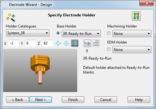 Note: The holder datum takes precedence over the electrode datum. Therefore the attachment position you define for the holder will affect the datum included in the Electrode setup sheet and EDM data-transfer files.