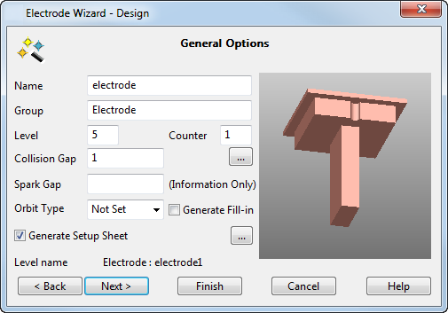 Electrode Wizard - Design avoids collisions between the electrode base and the active solid. The electrode base is automatically trimmed back to avoid collisions. The gap between the electrode base and the active solid is set using the