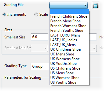 - Group — Use group grading to scale the whole shoe up or down by a range of scale factors, including user-defined scale factors (in X, Y and Z), standard grading schemes (using the