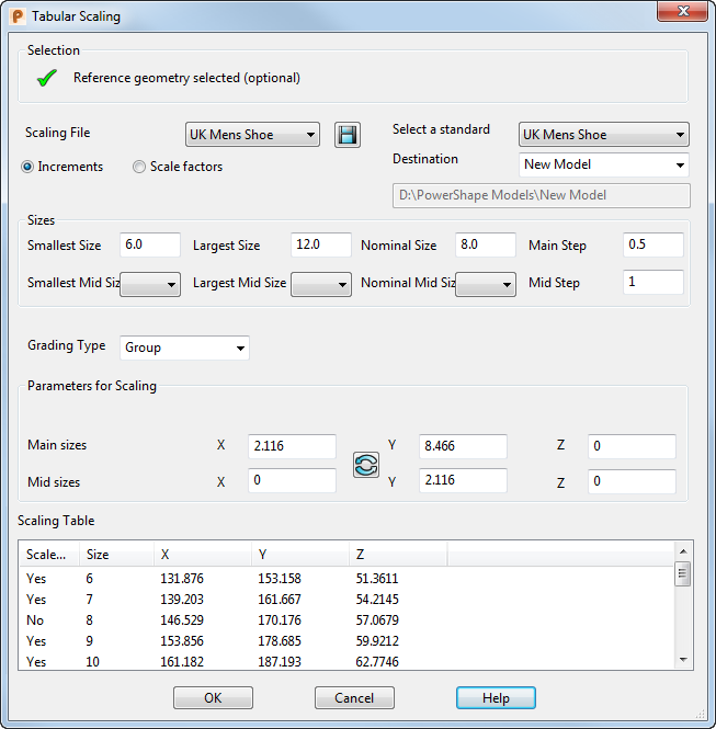 Generally, grading should be carried out from the internal dimensions of a shoe, rather than the external. However, if no reference geometry is specified, scaling is done based on the overall size of the shoe geometry.