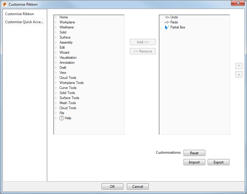 Import/Export — Click these buttons to import xml customization files, or to export the customized Quick Access toolbar as an xml file.
