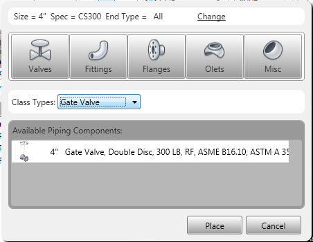 4. In Available Piping Components, click component (for example: Gate Valve, Solid Wedge, 300LB, RF).