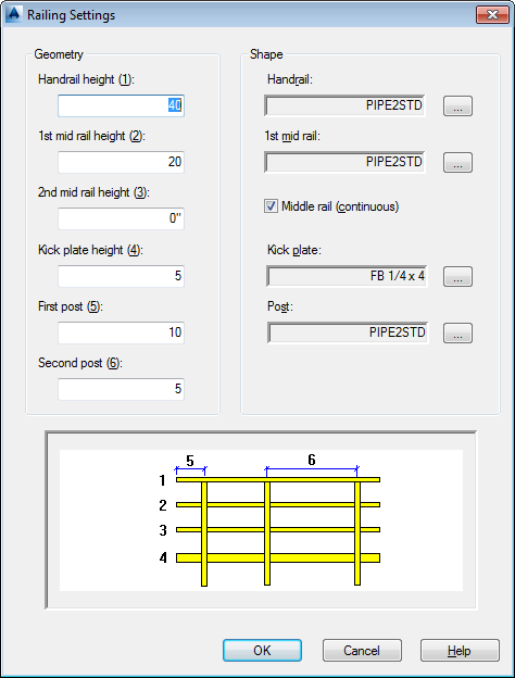 Edits the geometry settings for the selected railing. Numerical values indicated in parentheses correspond to the labeled geometry in the preview image.