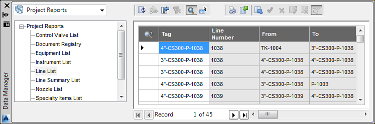 If you choose to build reports using the Data Manager, you can create new report types based on existing report templates. The templates include lists of equipment, lines, line summaries, instruments, valves, nozzles, and so on.