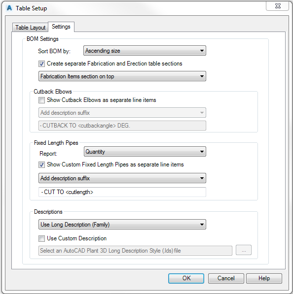 Select or clear the Use Custom Description check box. If you select the checkbox, click the [...] button to locate the AutoCAD Plant 3D Long Description Style (.lds) file you want. This file will set the format for all descriptions in the BOM. Click OK.