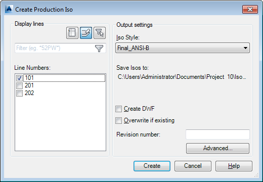 Creates a production isometric drawing. Specifies iso type, overwrite options, and DWF output.