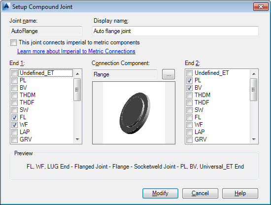 Selecting a checkbox in this column gives specifies that the joint connects Imperial (ANSI) and Metric (DIN) components.