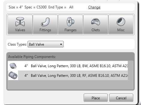 Specifies the component to place. Displays a list of piping components that match the current spec, size, end type, and class type.