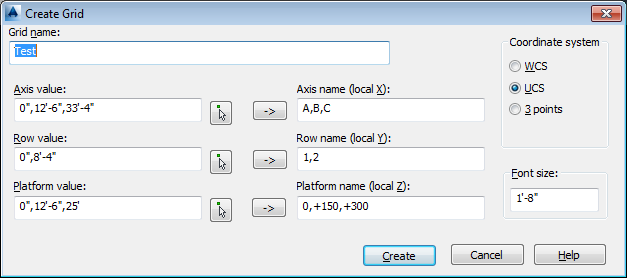 3. Under Coordinate System, click WCS, UCS, or 3 Points to set the coordinate system for creating the grid. If you choose 3 Points, specify the origin and direction of the three axes of the grid.