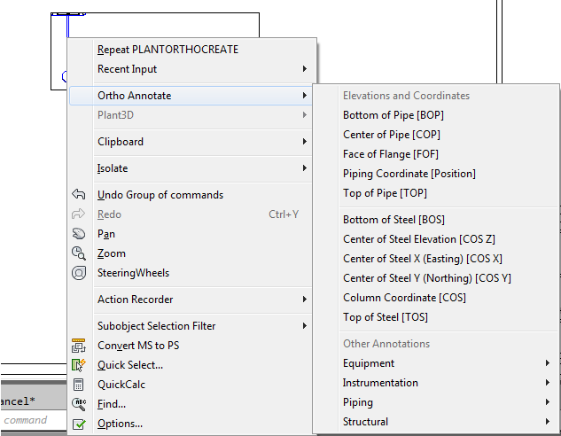 In the menu, click Ortho Annotate. Click the annotation you want, for example Bottom of Pipe [BOP].
