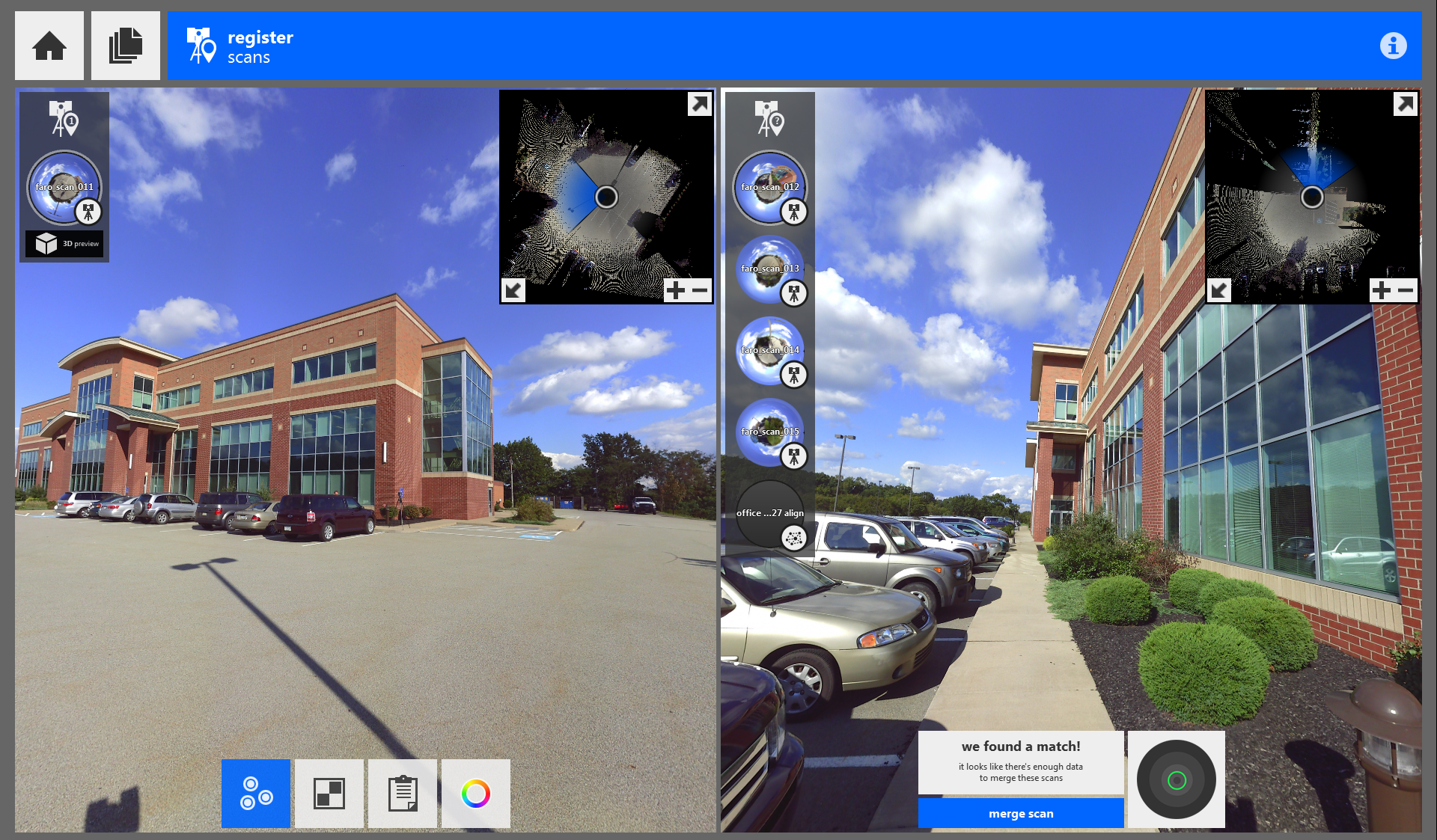 Manual registration can be completed through the cloud-to-cloud technique whenever Auto-Registration fails or in place of it. The tool can be accessed during the registration process from the bottom tool bar. Manual Registration is also only available in ReCap Pro.