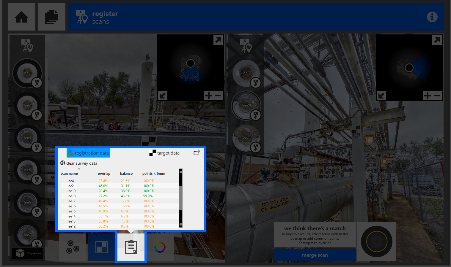 Another benefit of a ReCap Pro subscription is the inclusion of advanced reporting tools for accuracy feedback. Targets are especially useful to improve registration in environments without a lot of point features, such as parking lots, long empty halls, tunnels, and landscapes. Targets for reporting can be placed with either checkerboard or sphere targets during or after the registration process. The tools are available from the main registration pane.