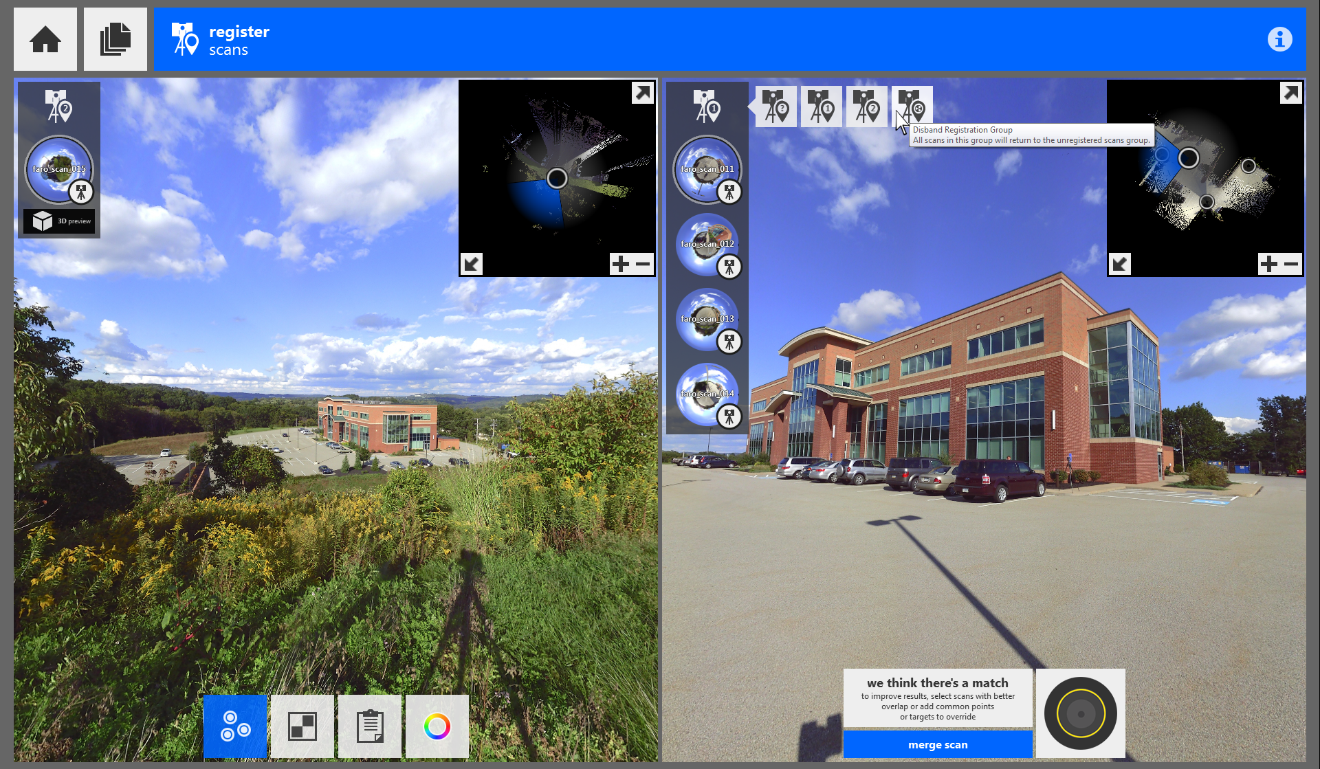 Once three points are placed in each scan, the registration process will automatically run again. If registration completes correctly, the scan will automatically merge into the main scan group.