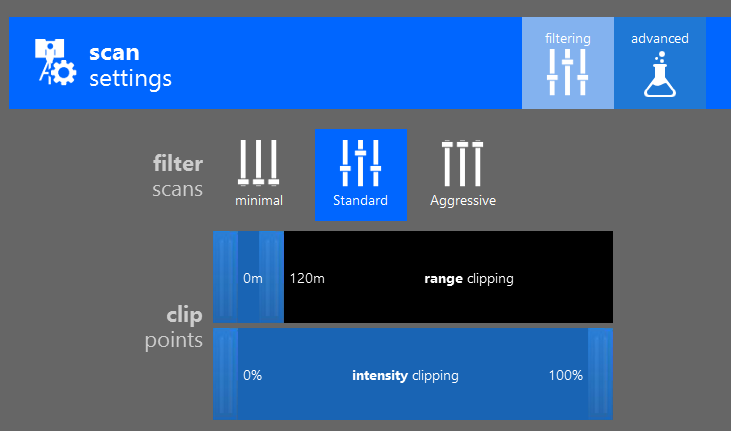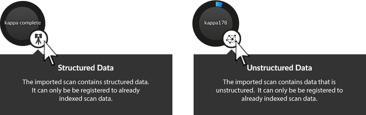 The files can be either traditional scans from a fixed location (structured files), scans from multiple locations, such as those produced by a UAV (unstructured files), or a mixture of both. The scan data type will be reflected by a badge on the individual scan thumbnail: