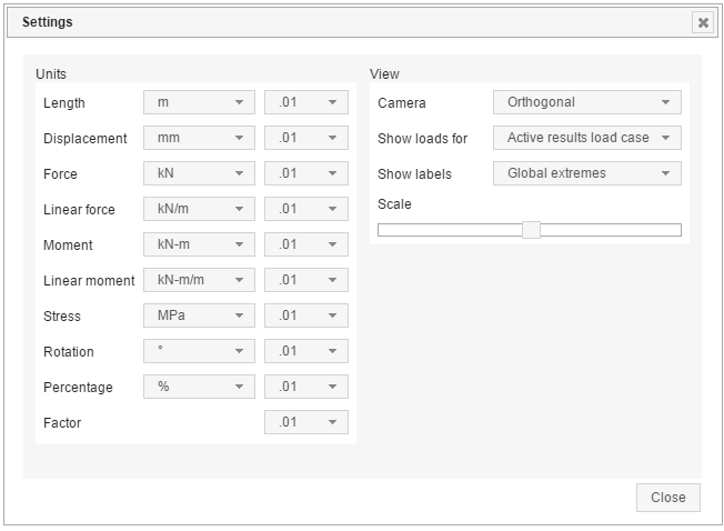Click the Open settings icon to open the Settings dialog where you can specify unit settings for results displayed in the view, and other display settings for the model and results.
