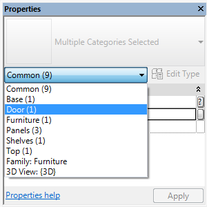 Immediately below the Type Selector is a filter that identifies the category of the elements a tool will place, or the category and number of elements selected in the drawing area. If multiple categories or types are selected, only the instance properties common to all display on the palette. When multiple categories are selected, use the filter’s drop-down to view only the properties for a specific category or for the view itself. Selecting a specific category does not affect the overall selection set.