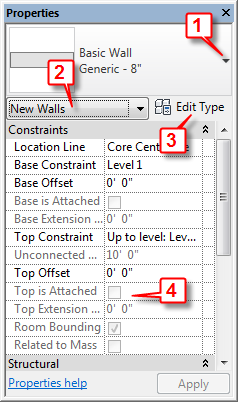 In most cases (see exceptions in note below), the Properties palette displays both user-editable and read-only (shaded) instance properties. A property may be read-only because its value is calculated or assigned automatically by the software, or because it depends on the setting of another property. For example, a wall’s Unconnected Height property is only editable if the value of its Top Constraint property is Unconnected. For specific dependencies, see the instance property descriptions for individual element types.