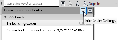 If you have Autodesk Account and Communication Center, you can customize settings such as notification behavior, RSS feeds, and Autodesk Channels in the InfoCenter Settings dialog box. To open this dialog box, click the InfoCenter Settings button at the top of the Autodesk Account, Communication Center, or Favorites menus.