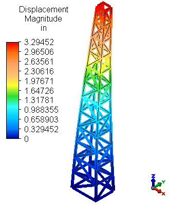 Resultant. The displacement magnitude shown is the resultant of the displacements for the five natural vibrating modes. The maximum displacement magnitude is approximately 3.3 inches, as shown in the following image.