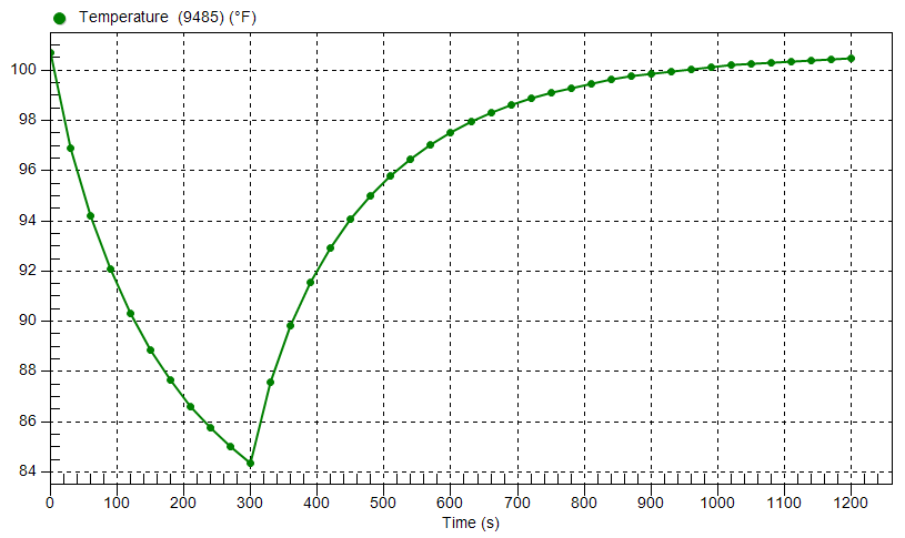The temperature of the selected node decreases about 16°F during the first 300 seconds (the cool off period). The temperature is still about 4° warmer than the ambient temperature at 300 seconds. Heat generation resumes at the rate of 5 Watts at 301 seconds and continues at that level for the remainder of the simulation event. During this 15 minute period, the chip almost reaches the steady-state temperature again (within 0.5°F).