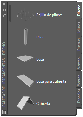 La paleta de herramientas Diseño contiene una herramienta de losa y losa para cubierta de muestra que puede utilizarse y personalizarse según sea necesario. Las paletas personalizadas creadas por el administrador de CAD o por otros usuarios también pueden contener herramientas de losa o losa para cubierta con estilos y propiedades personalizados según las normas de una empresa o proyecto.