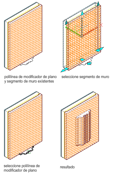 Utilice este procedimiento para crear modificadores de muro a partir de una polilínea abierta. Se puede dibujar la polilínea en la ubicación para el modificador de muro, o se puede proyectar el modificador creado sobre el muro. La polilínea no puede estar cerrada.