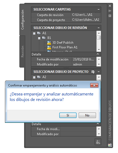 | emparejar dibujos manualmente | pulse No y, en el panel Seleccionar dibujo de revisión, seleccione un dibujo y arrástrelo a un dibujo del panel Seleccionar dibujo de proyecto. Cuando empareja dibujos con nombres diferentes de forma manual, se establece una relación entre ambos dibujos. Todo ello afecta a lo que se mostrará al usar el modo de filtro en la carpeta de proyecto. |