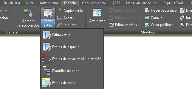Según el objeto que haya seleccionado, no sólo podrá acceder a los estilos de ese objeto, sino también a los estilos de objeto que funcionan como objetos de soporte. Por ejemplo, si selecciona un espacio, puede acceder a estilos de espacio, estilos de zona, plantillas de zona y estilos de tema de visualización.
