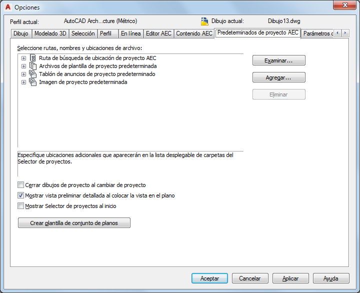Especificación de las opciones predeterminadas de Predeterminados de proyecto AEC para el dibujo actual