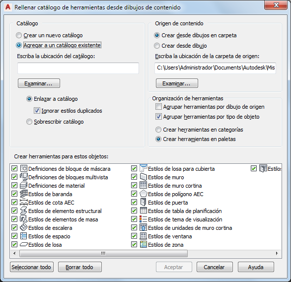 Peligro: Debe tener cuidado al utilizar esta opción, pues suprimirá todo el catálogo existente. Si sólo desea sobrescribir herramientas con las versiones actualizadas de un dibujo de contenido, seleccione en su lugar Enlazar a catálogo, y compruebe que no esté seleccionada la opción Ignorar estilos duplicados.