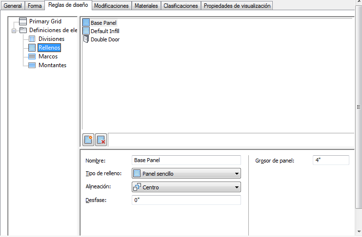 Puede modificar las definiciones de elementos en la ficha Reglas de diseño del cuadro de diálogo Propiedades de conjunto de puerta y ventana. Puede acceder a estas definiciones desde la lista de asignaciones y desde la lista de definiciones: